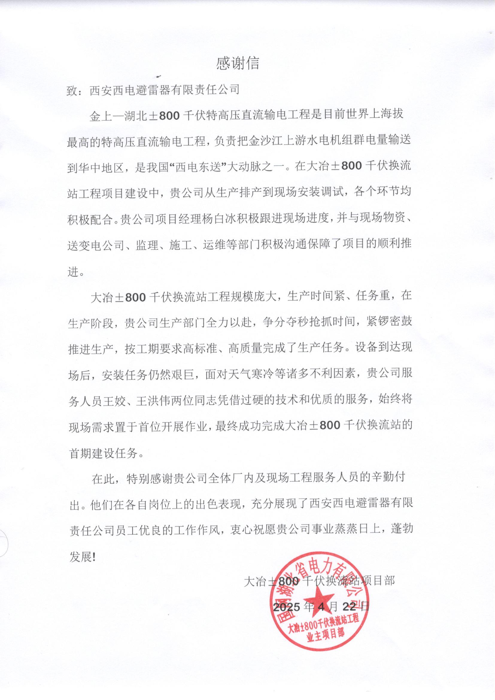这份感谢信是业主对milan米兰(中国)体育官方网站服务工作的高度肯定!未来,milan米兰(中国)体育官方网站将继续加强技术创新、品牌卓越,为国家电力贡献更大力量!