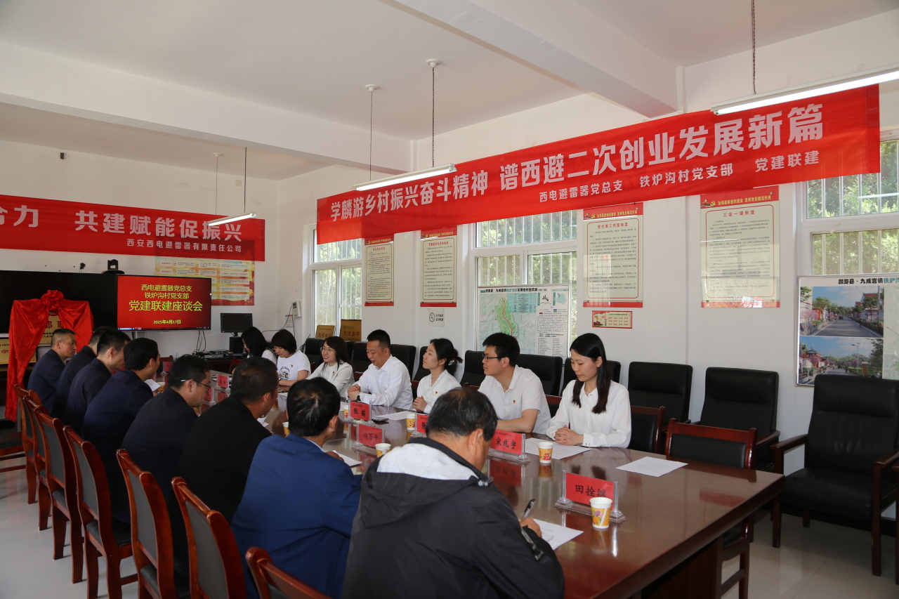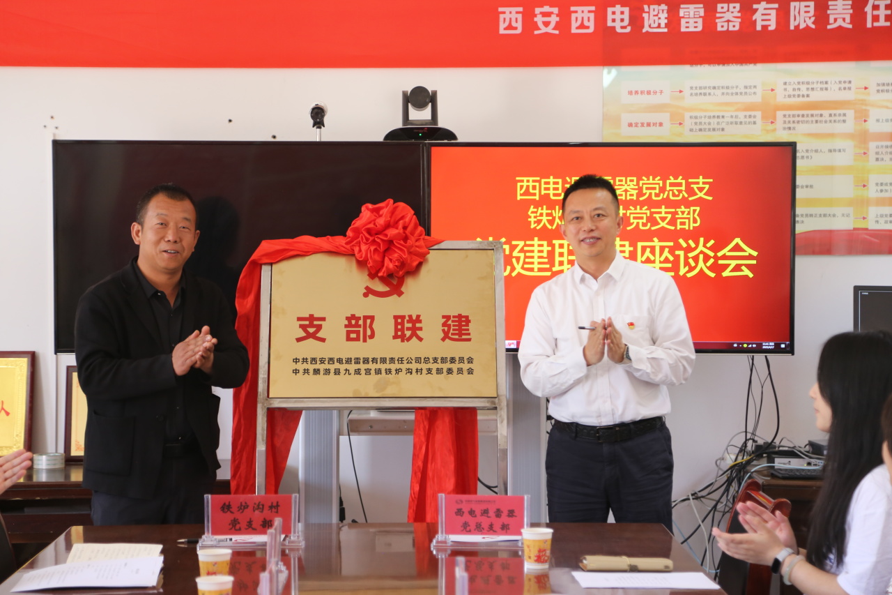 西电避雷器党总支与麟游县九成宫镇铁炉沟村党支部开展党建联建活动。西电避雷器党总支书记与铁炉沟村党支部书记签订《党建联建共建协议书》,为联建活动揭牌。双方围绕党建引领、资源共享、发展共谋开展座谈会,中共县委副书记山高飞,中共麟游县县委常委、副县长李凯,西电避雷器党总支书记、董事长、总经理何强,西电避雷器党总支纪检委员、工会主席、副总经理张苗,麟游县万家城驻村书记胡博及相关人员参加联建座谈。
